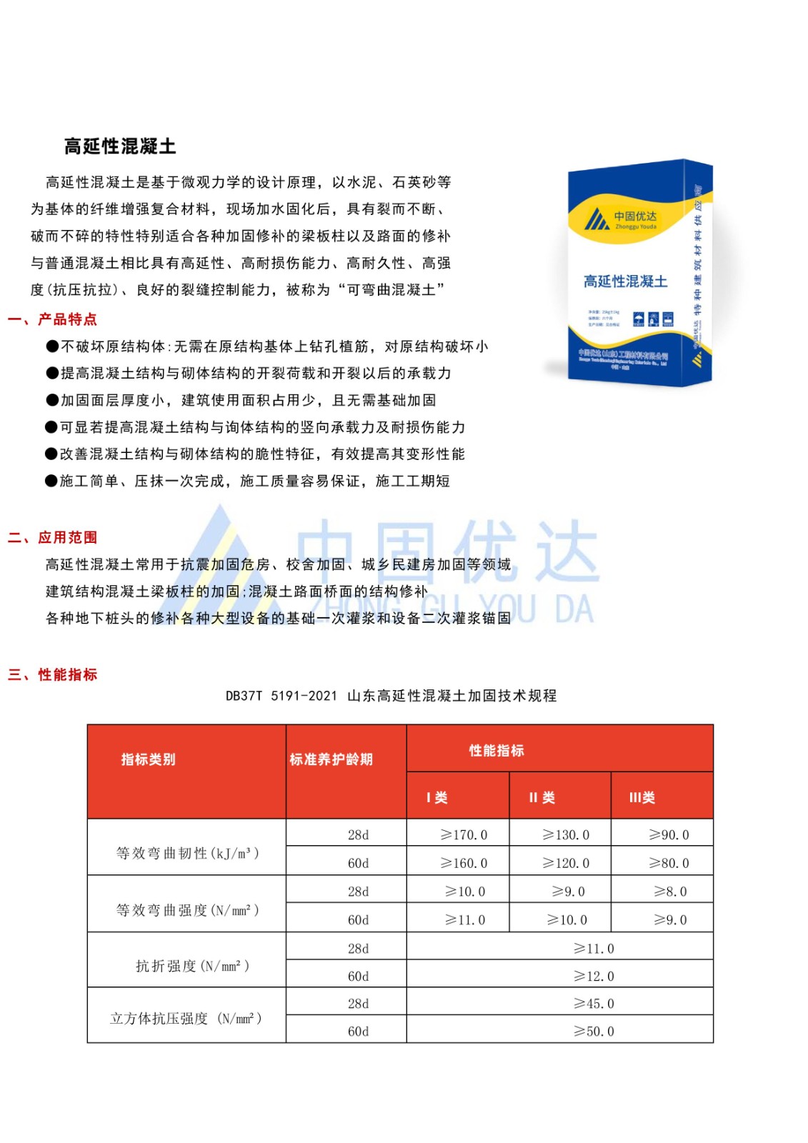 上海高延性混凝土 上海高延性混凝土是具有高抗裂性、高延展性、高韌性、高耐損傷的一種高富纖維混凝土,采用特種水泥和骨料,輔助高韌性高彈性纖維和外加劑混合而成,現場加水固化后,具有裂而不斷、破而不碎的特性,用于各加固修補的梁板柱以及路面的修補。
